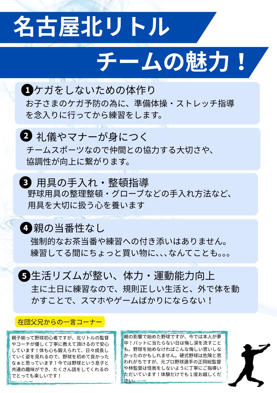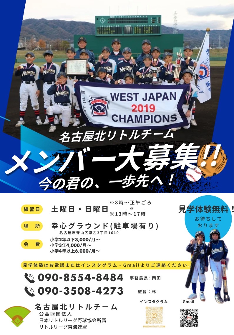 なおリトルリーグの規約で、2018年度より8月生まれまでのお子様は1学年上の所属チームとなります。
